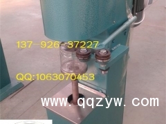 本机由电动机,皮带轮,主轴,压头,托盘,立柱,脚踏杆,滚刀,手柄等组成。电动机通过三角皮带转动,带动主轴及上压头旋转,罐体同步旋转,压头同时起到压紧罐盖密封罐体的目的,压紧力度以手感适度即可,滚刀在手柄的作用下,先后压紧罐盖,封口工序完成。调整罐径:通过手柄下的微调螺母来调整头道滚刀与压头的距离,两道滚刀用滚刀的偏心轴调节完成。调整罐高:通过增加或减少导套来完成。